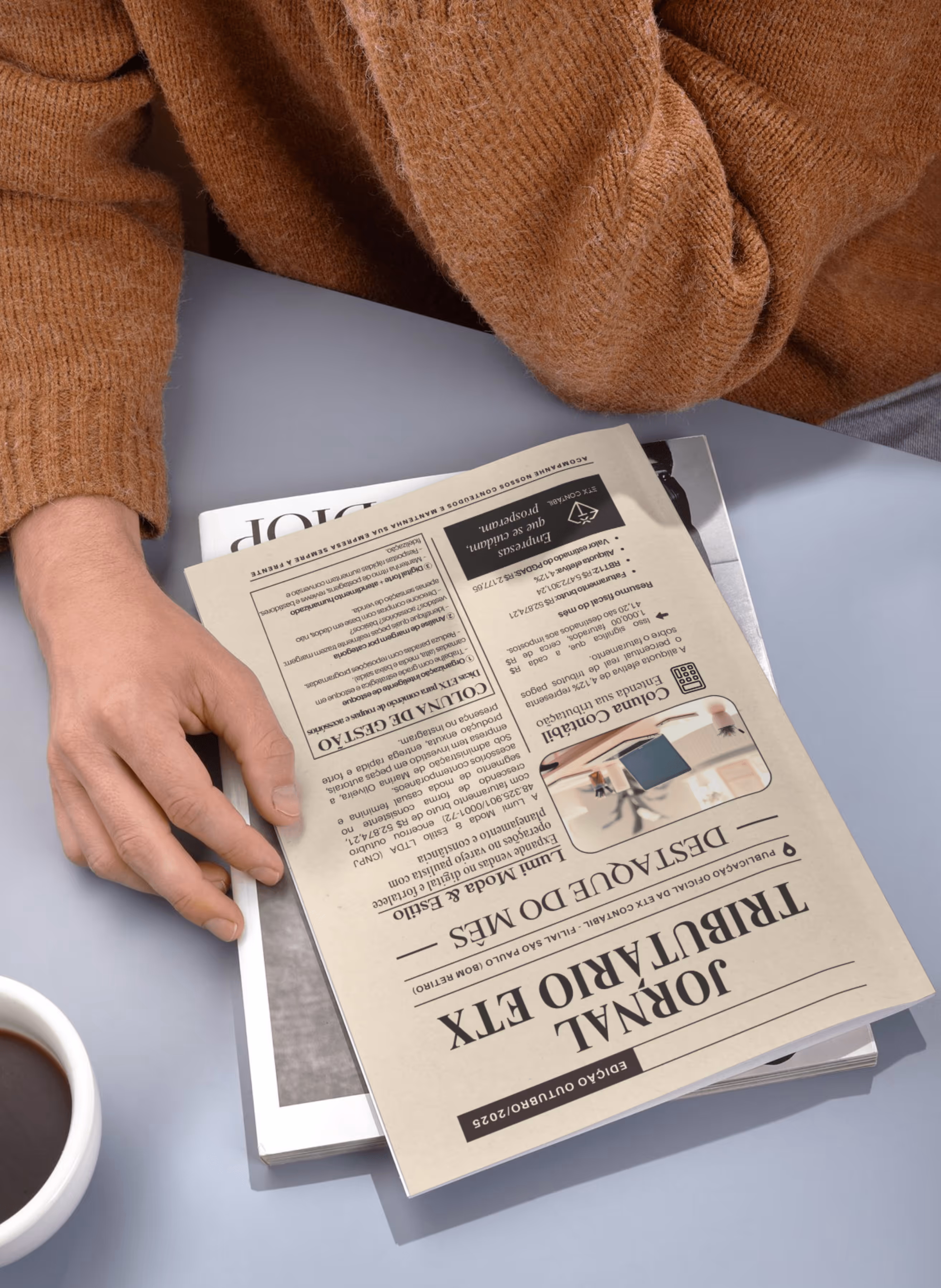 Cada cliente recebe um jornal exclusivo com informações fiscais reais da própria empresa.